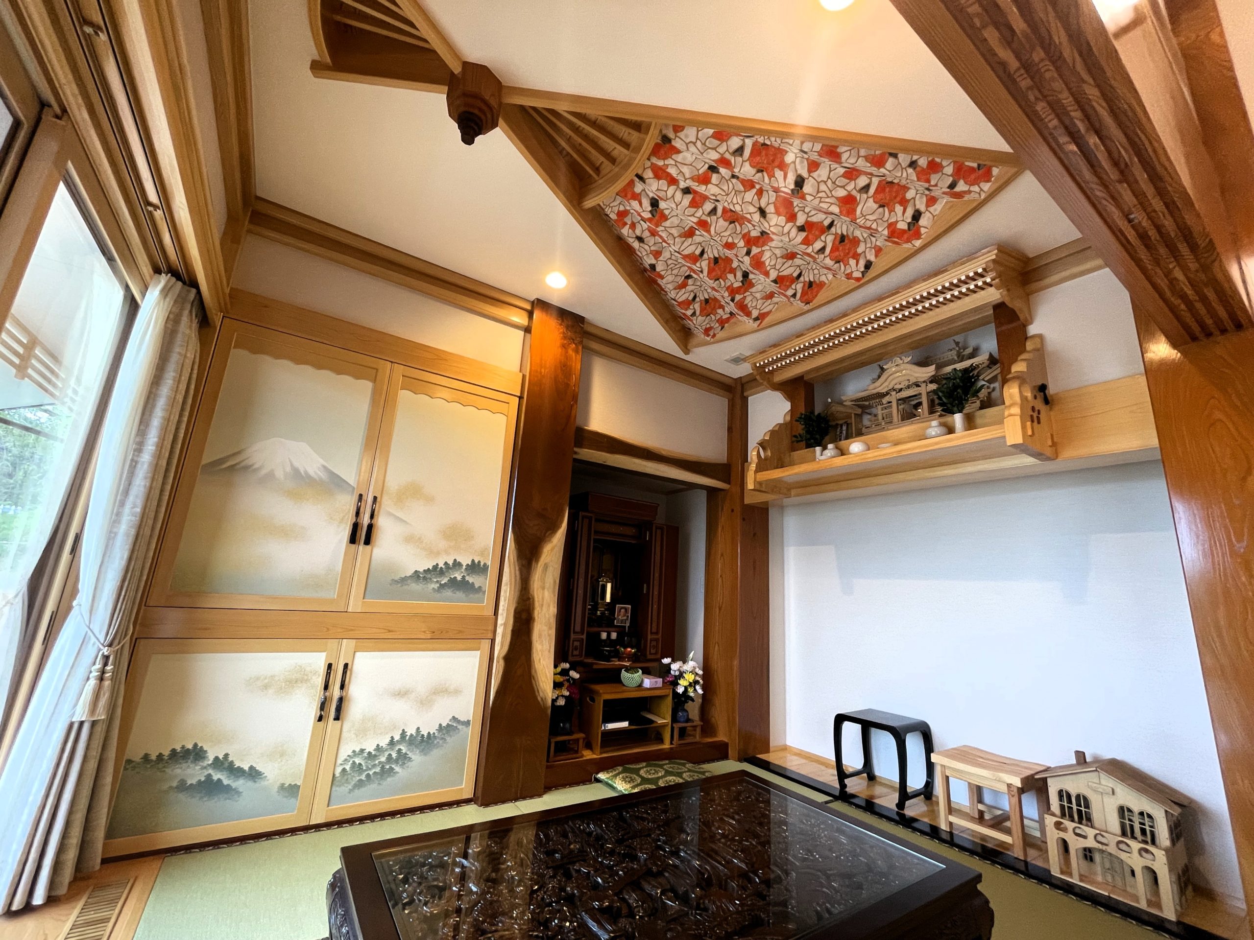 押し入れの富士山が目をひく和室。さらに扇のデザイン天井を採用しました。
